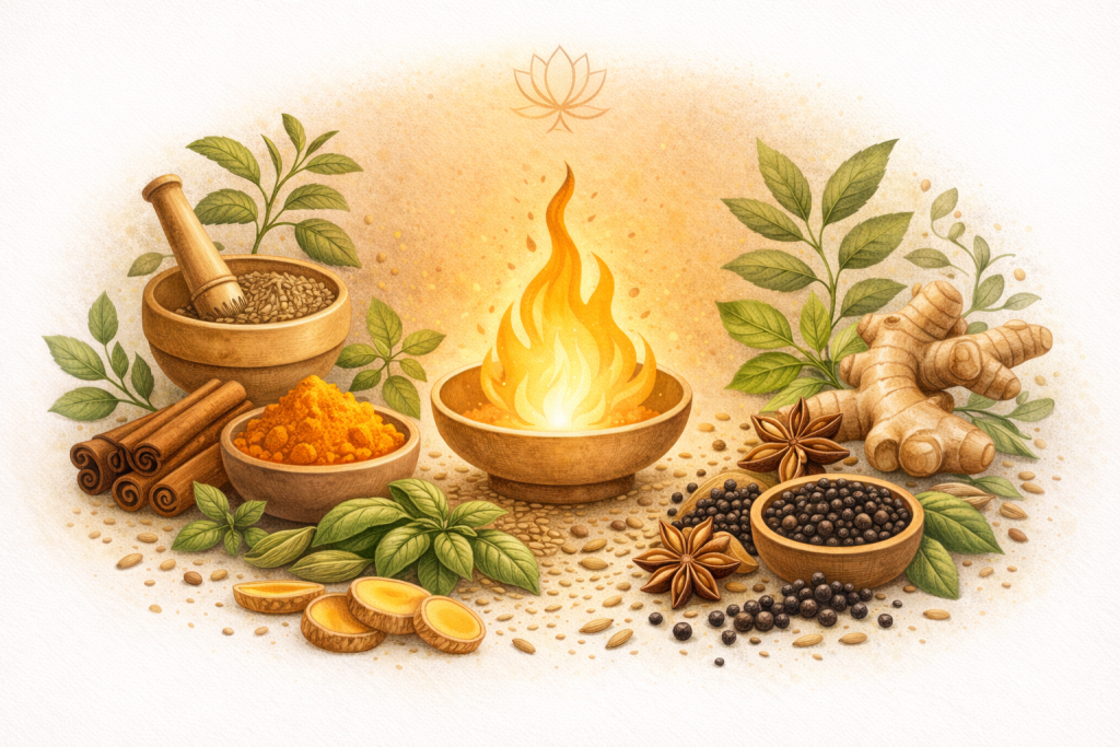 Ayurvedic spices like ginger, cumin, and fennel strengthen Agni, reduce gas, prevent Ama formation, and improve overall digestive efficiency.