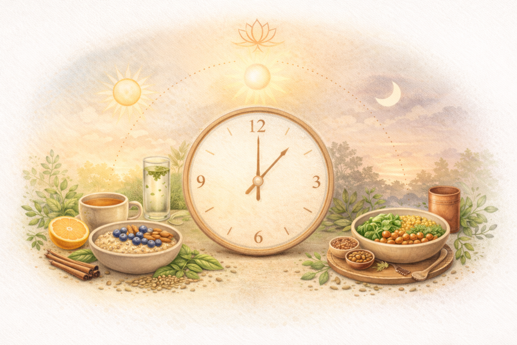Eating meals on time maintains digestive rhythm, prevents overload, balances doshas, and allows complete digestion and nutrient absorption.