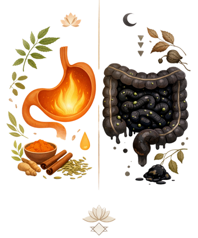 Ama is toxic, undigested waste formed due to weak digestion. It accumulates in the gut and tissues, blocking channels and becoming the root cause of many chronic digestive and lifestyle diseases.